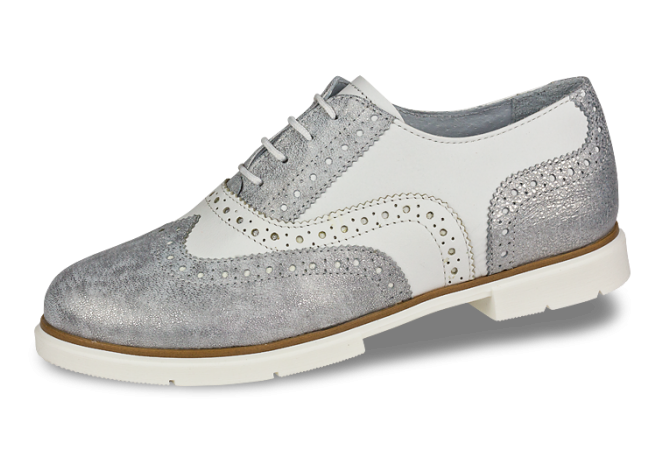 Стилен модел дамски обувки, който ще ви осигури комфорт и удобство през целия ден. Моделът е решен в елегантна цветова комбинация със сребристи отенъци, а визията му е ефектно допълнена от декоративна перфорация.