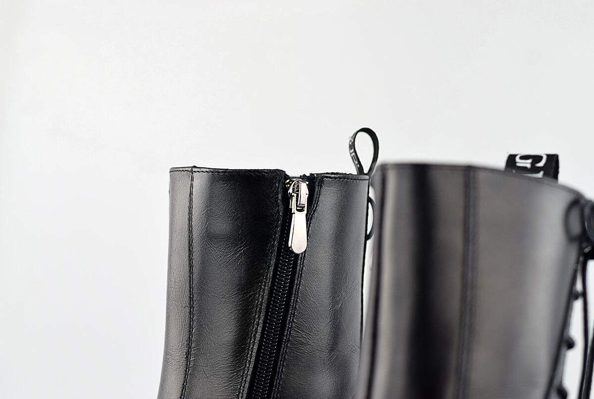 Едно от най-удобните предимства на тези дамски боти тип кубинки е наличието на страничен цип, който улеснява обуването и събуването. Не е нужно да губите време в борба с връзките – просто ги поставете на краката си и сте готови да тръгнете.