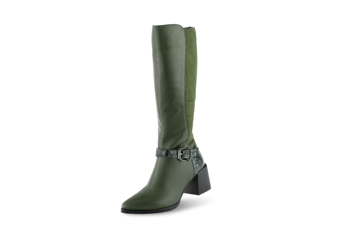 Изработени от комбинация от естествена кожа и естествен велур в стилен цвят олив, тези ботуши съчетават комфорт и модерен вид. Ефектът се завършва от изискана катарама и анималистични елементи, които придават уникален характер на обувката. С тях всяка дама ще се почувства уверена и забележима.