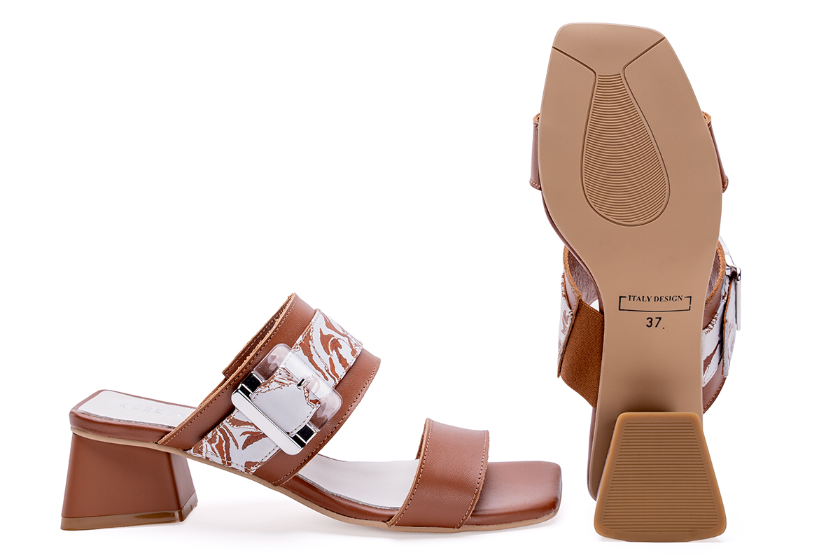 Дамски чехли от висококачествена естествена кожа в цвят таба. Височината на тока е 4 см., добре съобразена с натовареното женско ежедневие. Акцентът пада върху коланчето от естествена кожа с принт, завършено с ефектна катарама, придаваща един забележителен завършек.